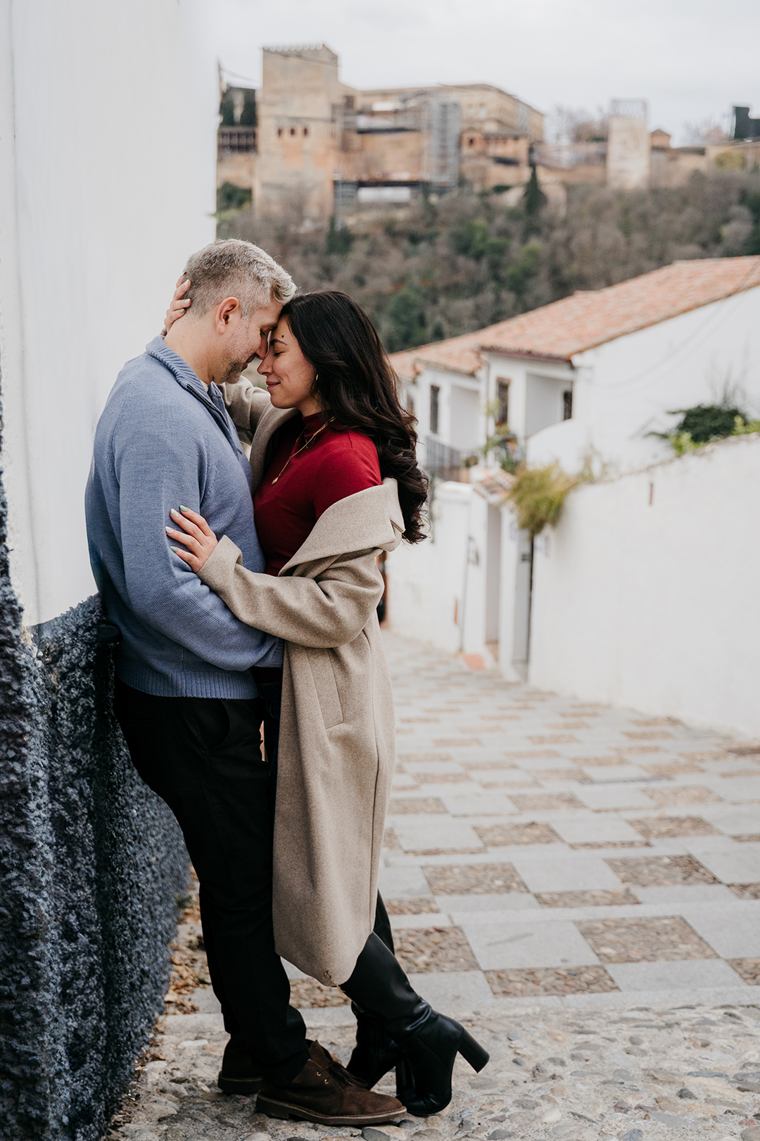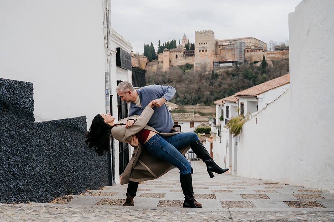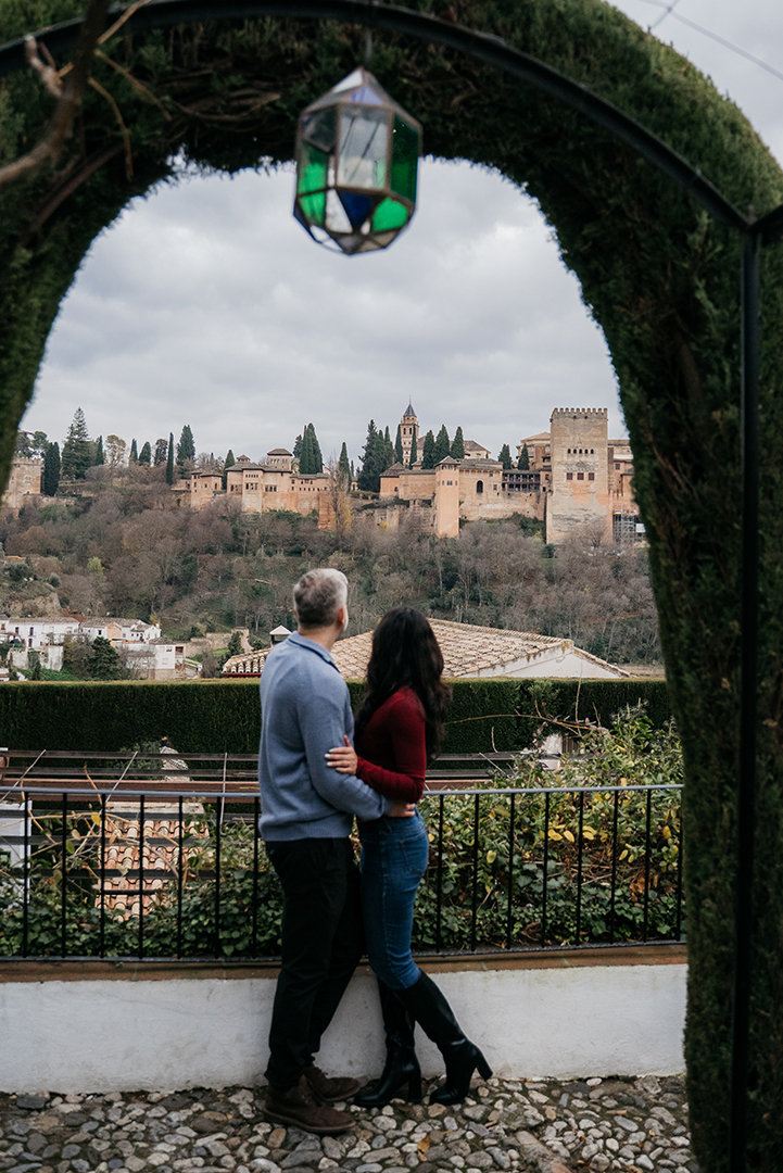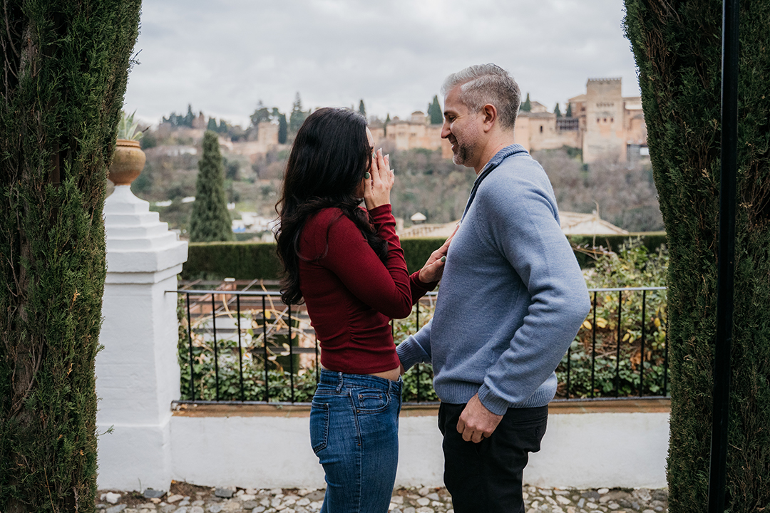 Esta sesión de fotos de pedida de mano sorpresa fue en el Albaicín, uno de los lugares más románticos de Granada con vistas a la Alhambra.