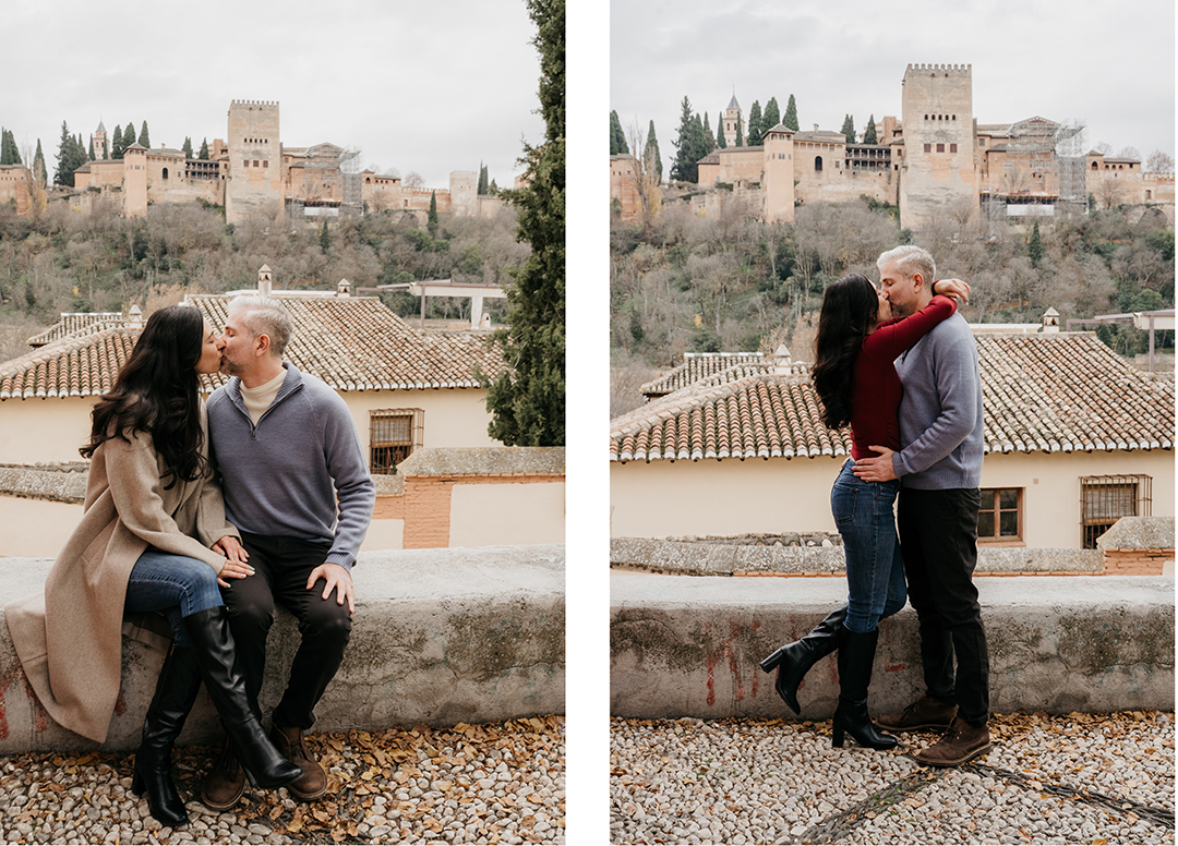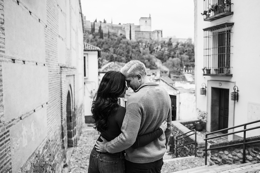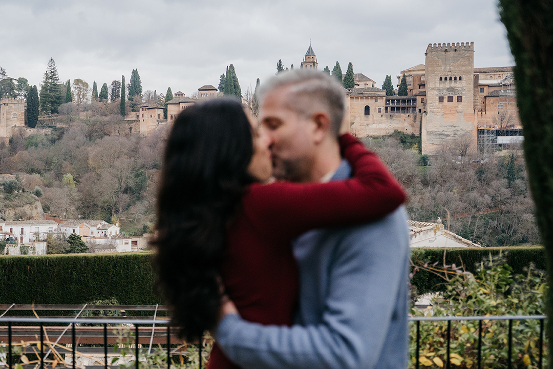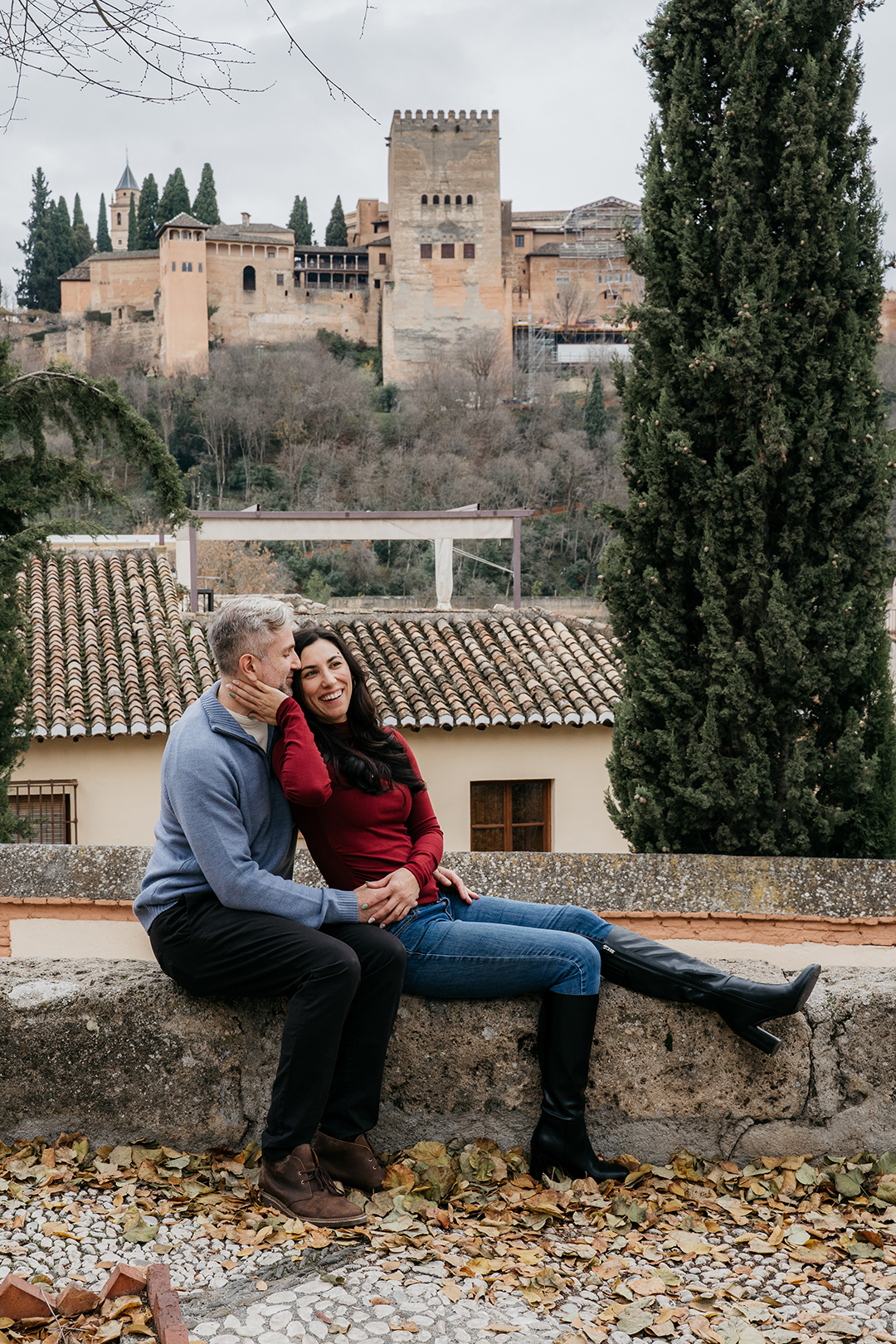 Esta sesión de fotos de pedida de mano sorpresa fue en el Albaicín, uno de los lugares más románticos de Granada con vistas a la Alhambra.