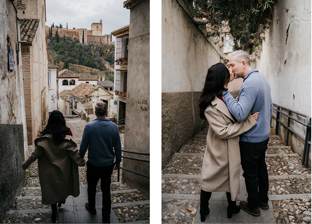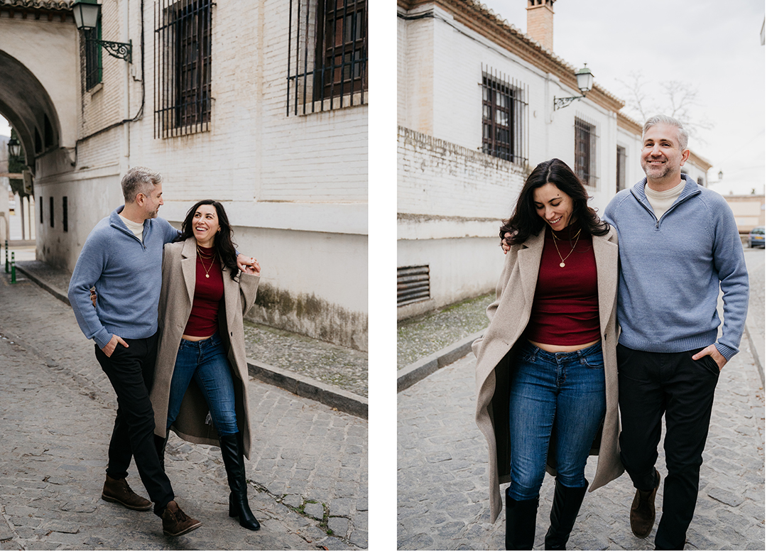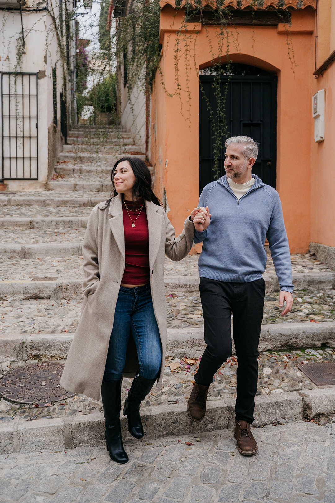Comenzamos en uno de mis miradores favoritos de Granada y, desde allí, nos adentramos en un paseo por el Albaicín bajo: calles empedradas, cuestas con encanto y rincones llenos de historia. A cada paso, las vistas a la Alhambra nos regalaban un paisaje único, de esos que hacen que cada esquina parezca un escenario perfecto para hacer una fotografía de pareja.