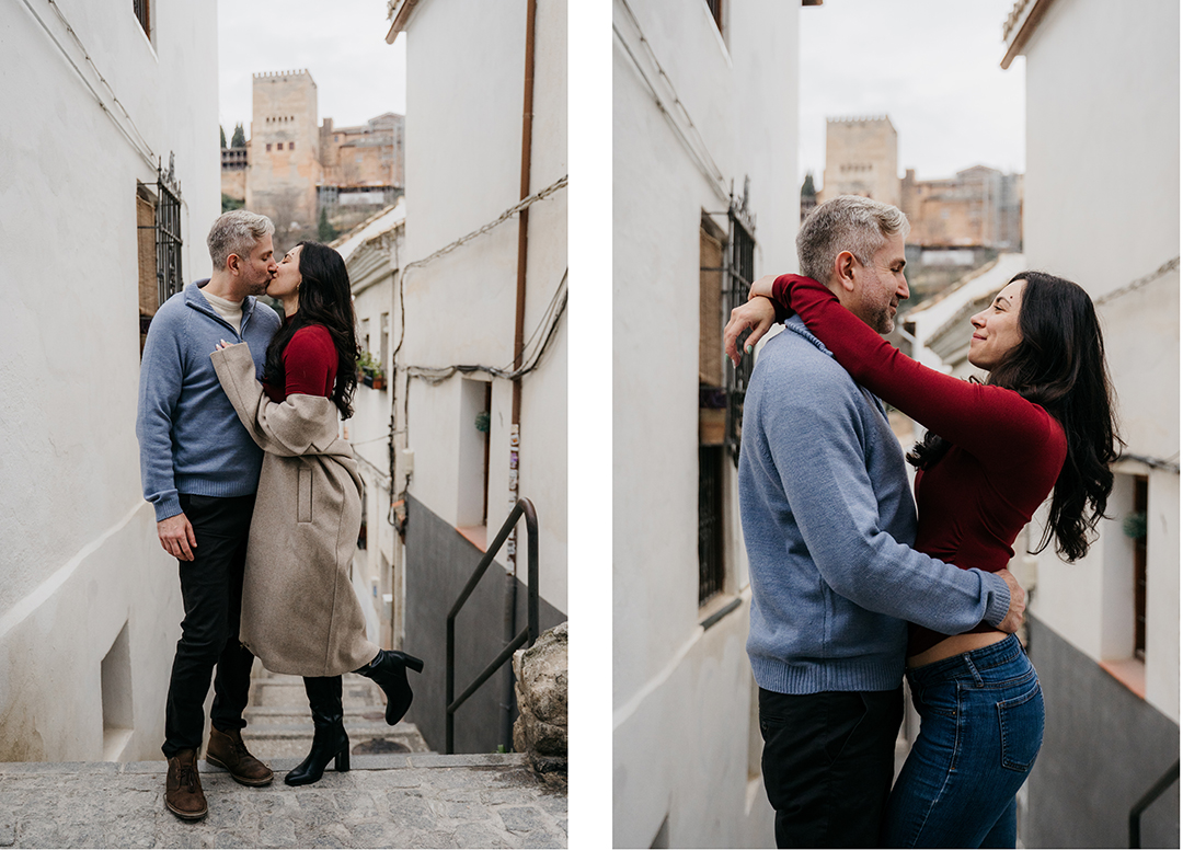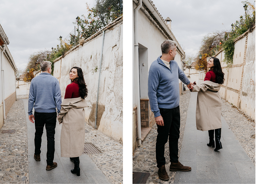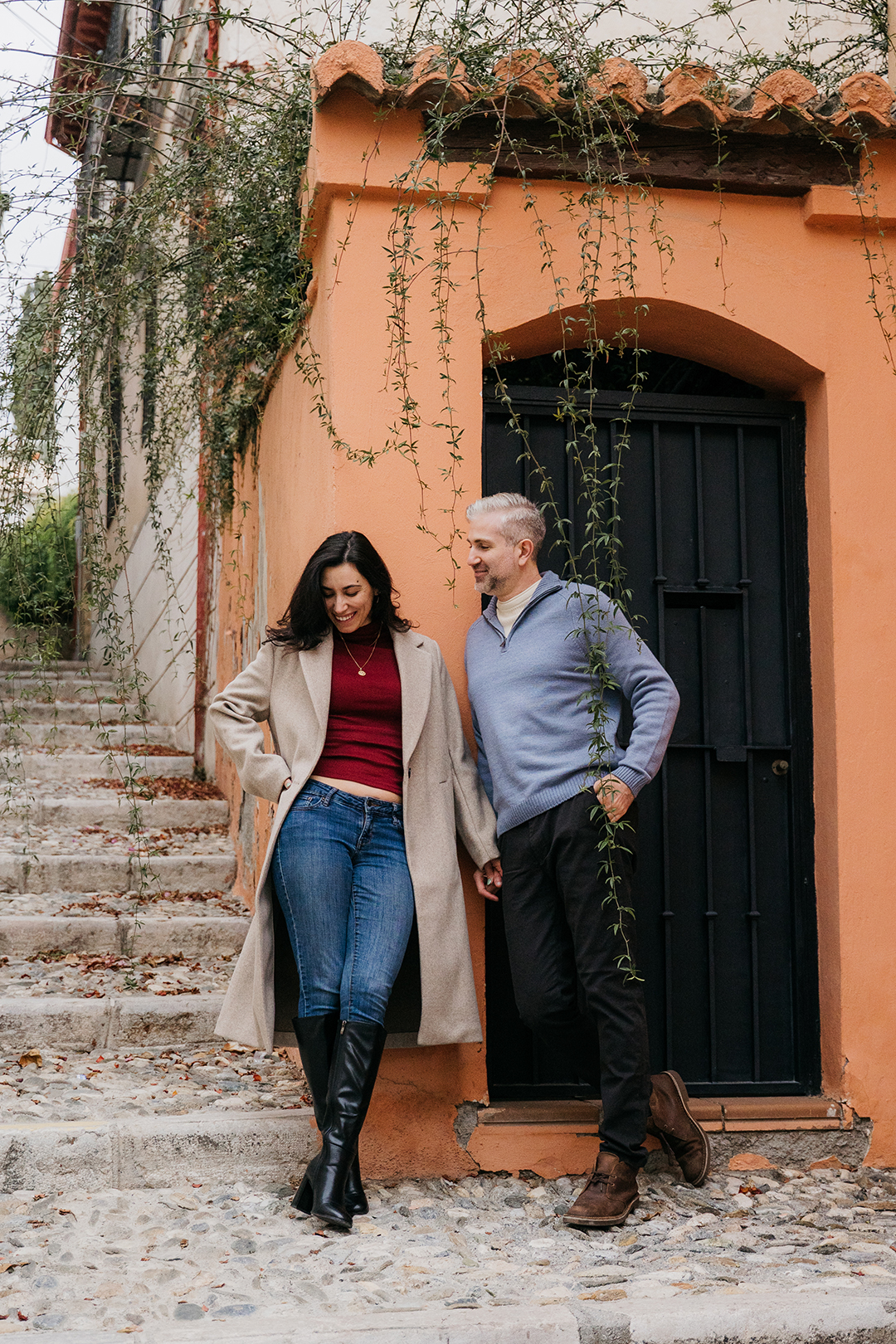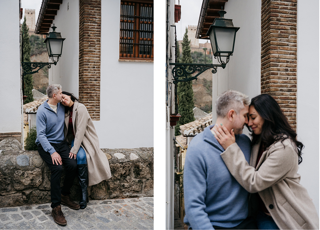 Comenzamos en uno de mis miradores favoritos de Granada y, desde allí, nos adentramos en un paseo por el Albaicín bajo: calles empedradas, cuestas con encanto y rincones llenos de historia. A cada paso, las vistas a la Alhambra nos regalaban un paisaje único, de esos que hacen que cada esquina parezca un escenario perfecto para hacer una fotografía de pareja.