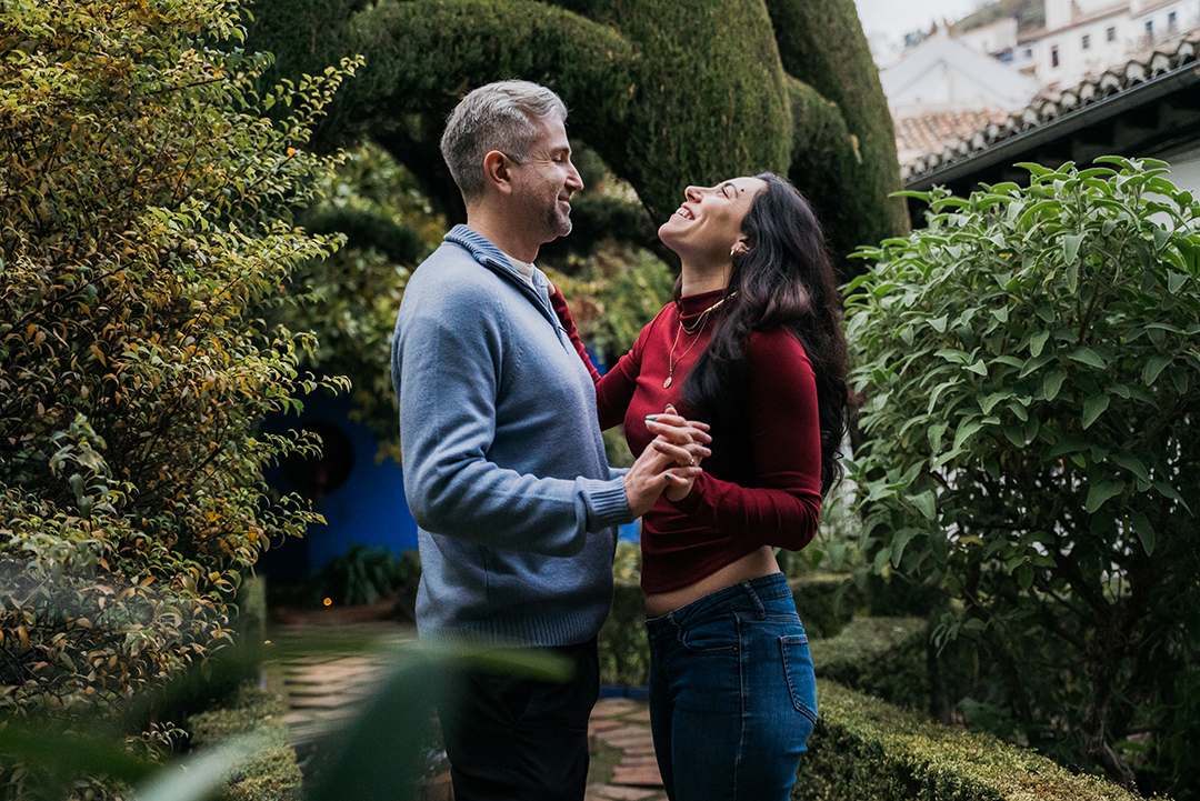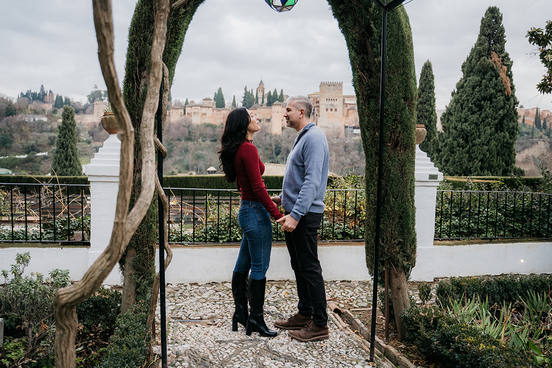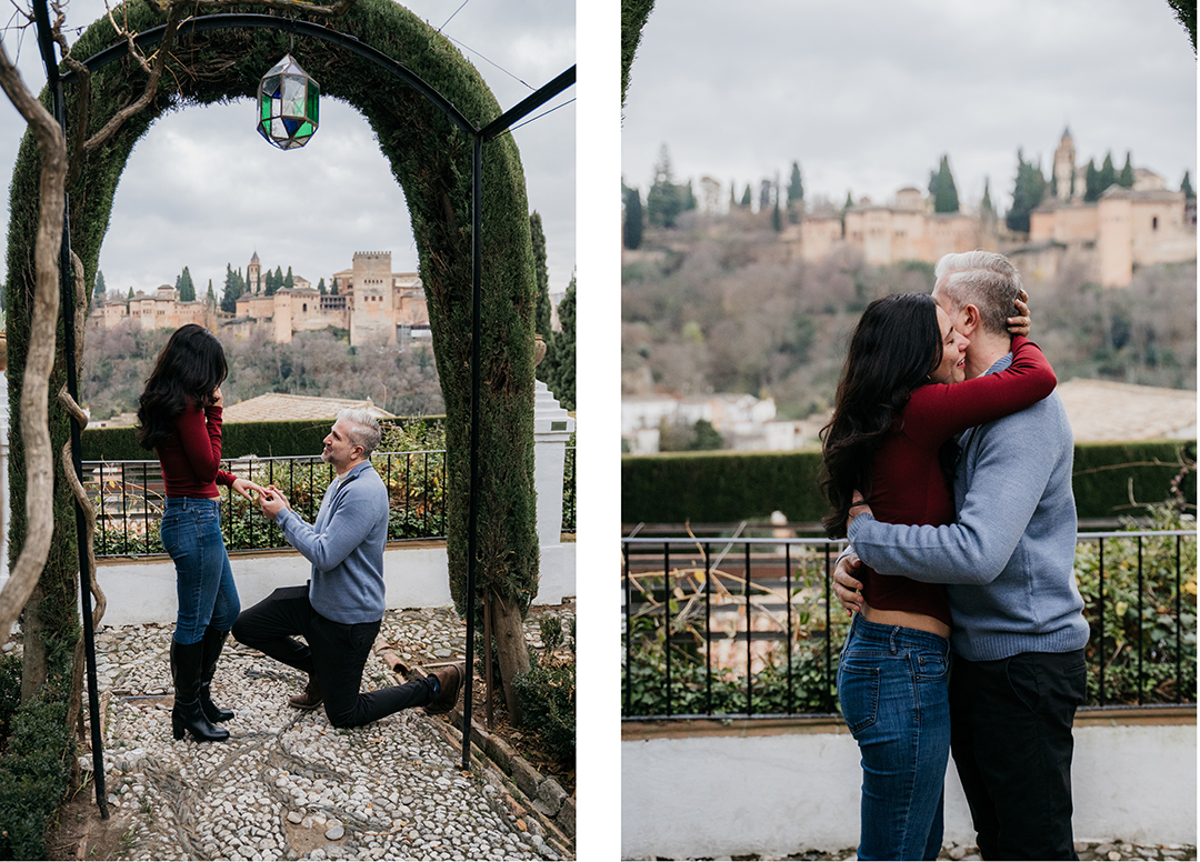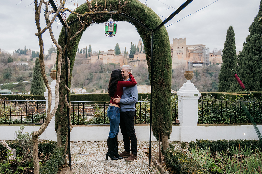 Después de un rato, los fui guiando poco a poco hacia el lugar donde Daniel y yo habíamos pactado que sería la pedida de mano sorpresa en Granada para Marissa: un carmen precioso y tranquilo,con unas vistas espectaculares a la Alhambra que lo hacían aún más mágico. El ambiente, la luz y el silencio del lugar creaban el escenario perfecto para un momento que ninguno de los dos olvidará jamás.